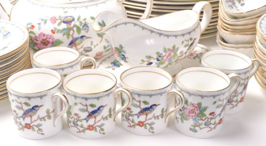 Aynsley Pembroke - A Bone China English part dinner / tea and coffee service by Aynsley hand painted in the Pembroke pattern. The service comprising of twelve dinner plates, twelve side plates, twelve smaller plates / saucers, two serving platters, two serving bowls, gravy boat and saucer, nine small oval dessert bowls, coffee pot, six coffee cans, six saucers with some spares, ten soup bowls and saucers, two tureens, rectangular dish, centrepiece bowl, two teapots, sugar bowl and cover, two milk jugs, tall and a vase. All bearing marks to the bases.