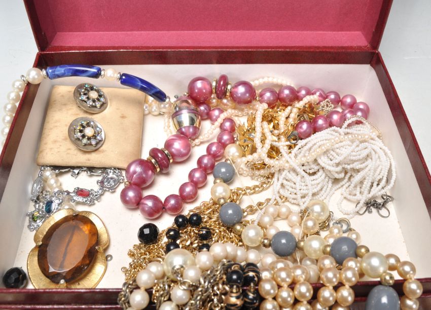 A collection of vintage costume jewellery to include mid Century gilt brooches and earrings mounted on original cards (two marks Mistas Fashion), simulated pearls, yellow metal necklace chains, a yellow metal knot design necklace, clip on earrings etc.