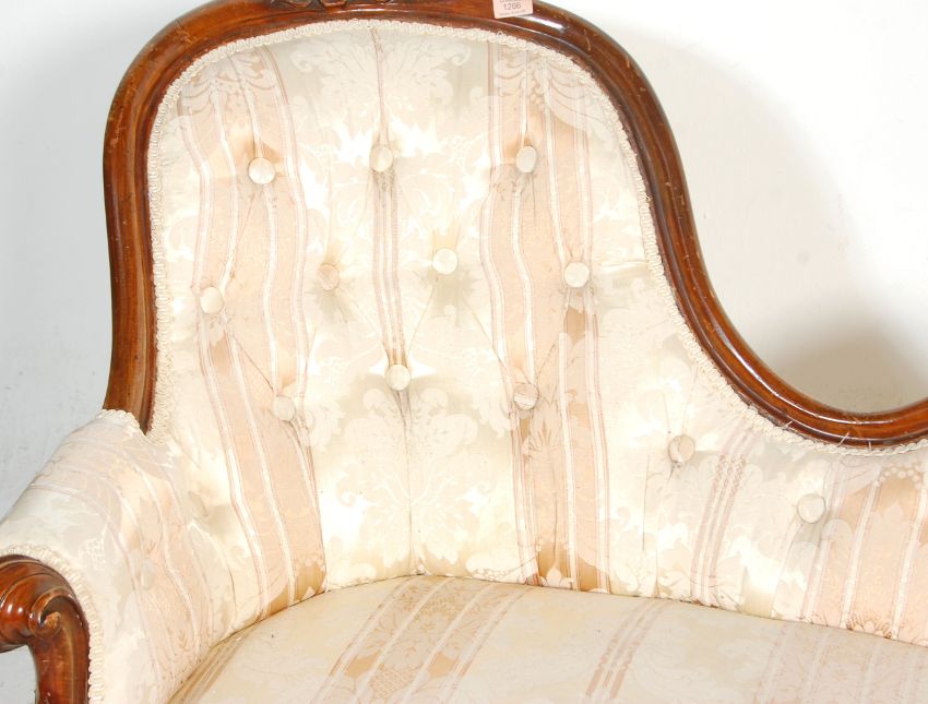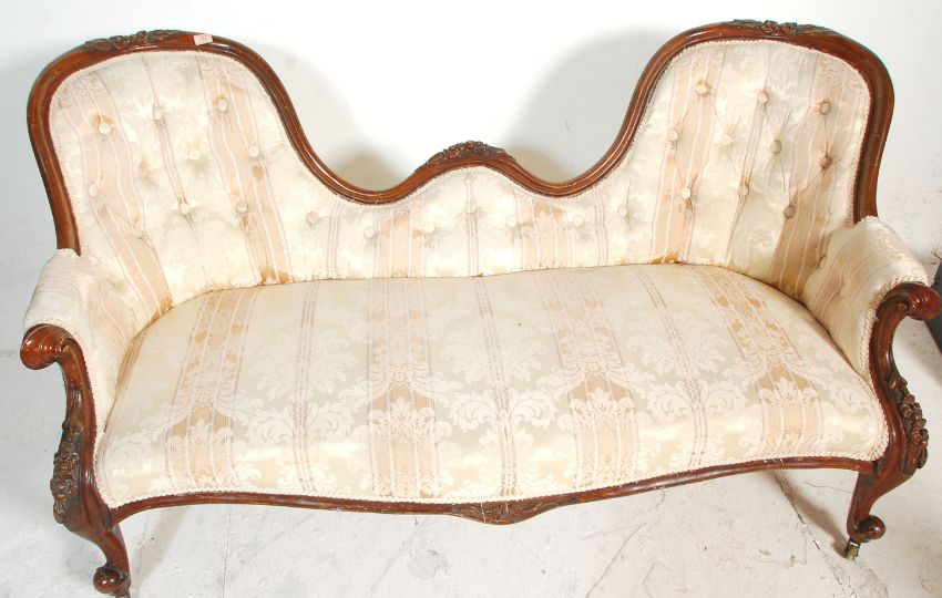 A 19th century Victorian mahogany double scroll end Chesterfield conversation sofa settee. Raised on shaped legs with c-scroll feet terminating in castors supporting a large and wide frame with carved show wood having reeded detailing to the leading edges. well upholstered to the overstuffed seat and back rest. Measures