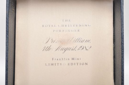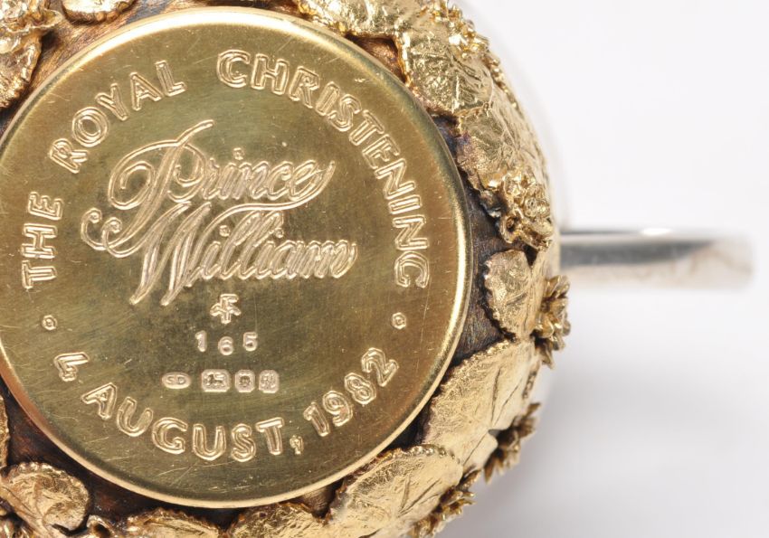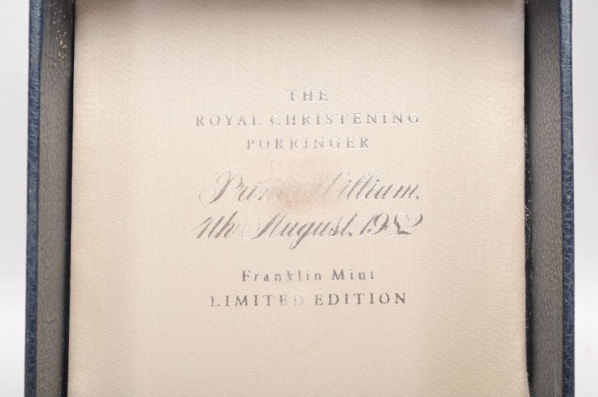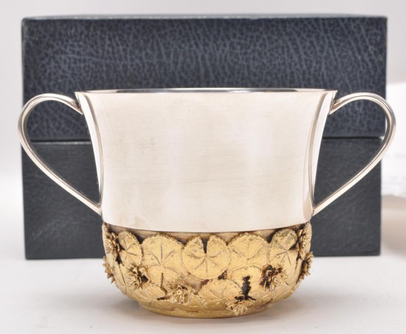 A solid silver Franklin Mint 4th of August 1982 Prince William Royal Christening commemorative loving cup having gilt lily pad decoration to the base, complete in presentation box. Hallmarked London 1982. Weight 151g.