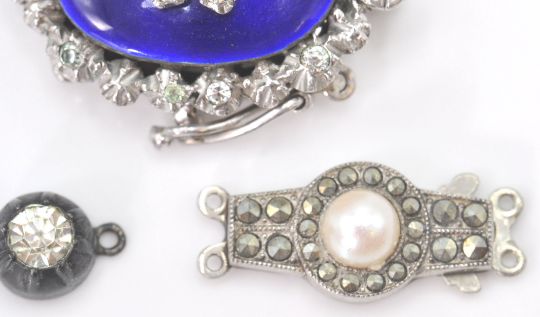 A collection of vintage silver and enamel set clasps to include Victorian single stone, larger enamel and rhinestone hallmarked pendant and another. Total combined weight. 16.76g