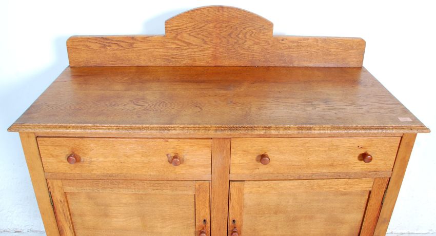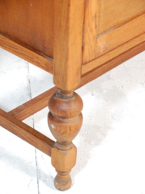 A 20th Century 1930's oak side cupboard / serving sideboard credenza having twin drawers above twin cupboards with knob handles raised on turned knopped supports united by stretchers with a gallery back to the top. Measures 117x121x48cm.