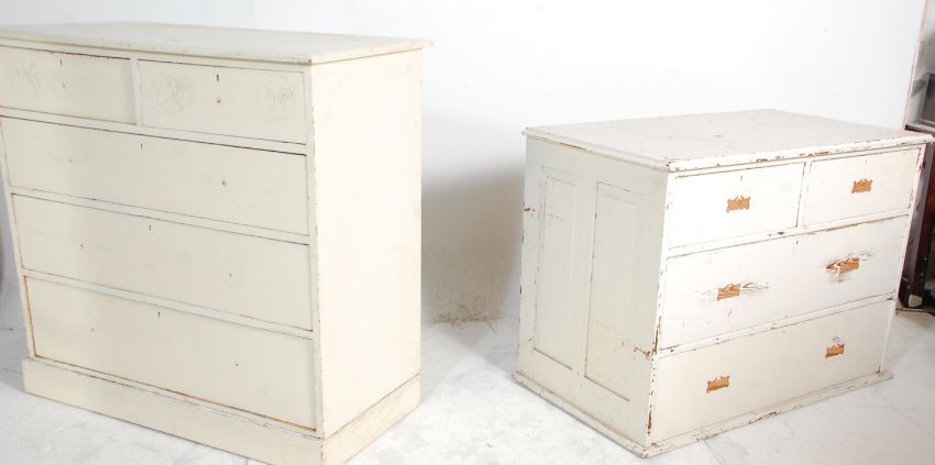 A pair of Victorian 19th century shabby chic painted 2 over 3 chest of drawers. One raised on a plinth base with  2 short drawers over 3 deep drawers beneath having panel fronts both needing handles. Measure