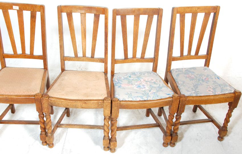 A set of four  early 20th century Art Deco oak barley twist dining chairs. Raised on barley twist supports united by stretchers having drop in seats and finished with sunburst ray  back rests.