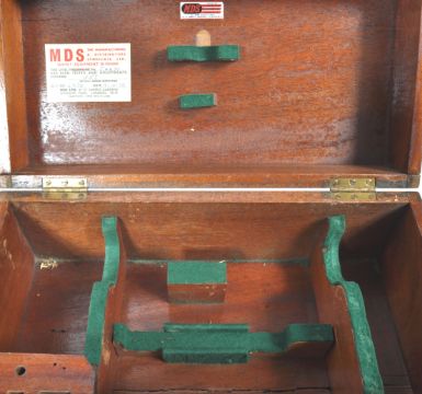 A group of vintage wooden Hilger and Watts and MDS theodolite and equipment boxes, complete with original labels to the inside. Complete with leather straps.