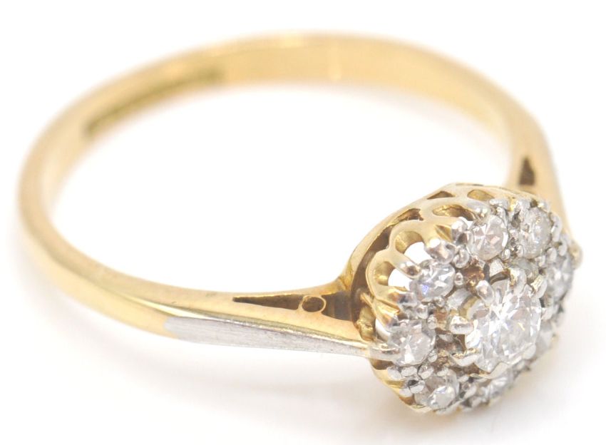 An 18ct gold and platinum diamond cluster ring. The ring having a central round brilliant cut diamond surrounded by a halo of smaller round brilliant cuts, having a pierced gallery mount, to the plain tapering shank. Estimated diamond weight 0.50ct. Principal diamond approx 0.15ct. Size M.5. Total weight 2.5g.