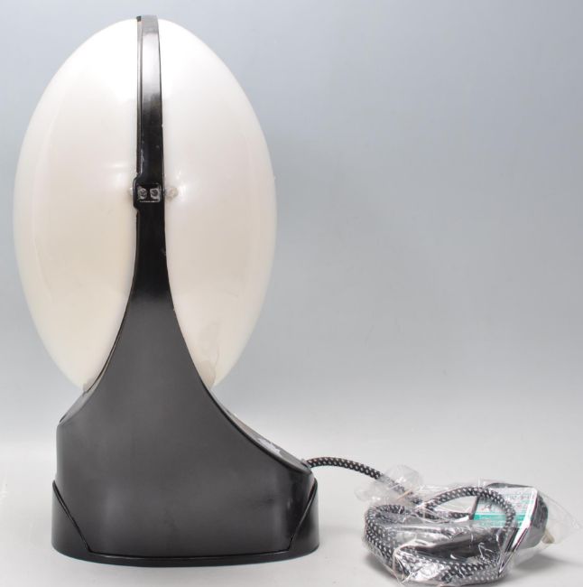 A mid 20th Century Art Deco style wall light converted into a table lamp having an opaline perspex diffuser in two halves forming an egg shape on a black metal shaped base. Measures; 41cm tall.