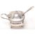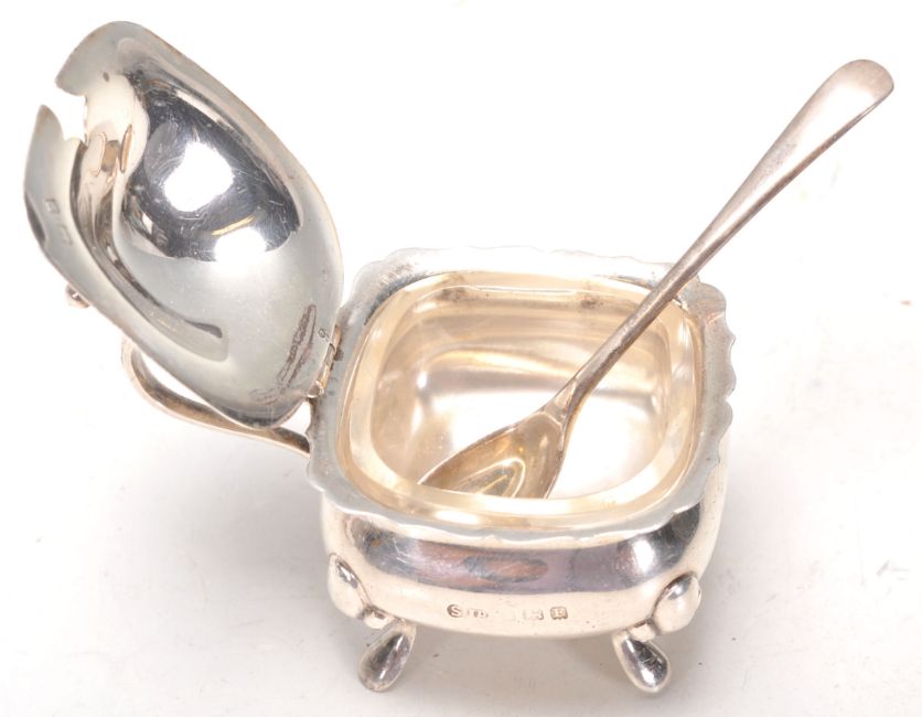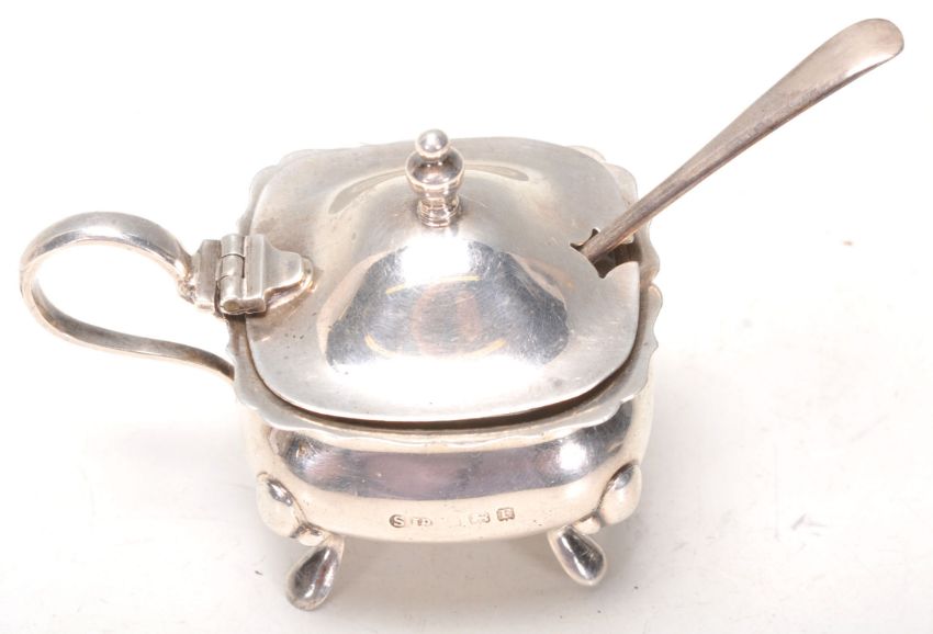 A hallmarked Sterling silver mustard pot set upon four figured feet with a hinged lid and finial with liner and spoon inside. Hallmarked London Makers Mark William Suckling Ltd. Dated 1940.