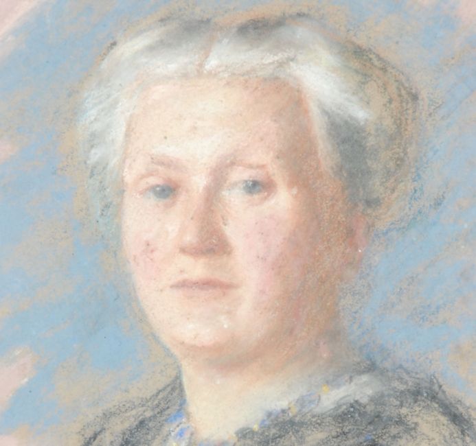 Cecil Lallee - An early 20th Century chalk pastel study -painting depicting a portrait of a lady wearing a blue stone necklace and black dress, set within an ebonised and gilt oval frame. Paper labels to verso reading Royal Institute Galleries Piccadilly London, Portrait of Mrs Bailward, Artist Mrs Cecil Lallee, framed a Middleton's on King's Road Chelsea. 44cm x 53cm.
