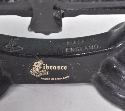 A set of early 20th Century Librasco balance scales having an ebonised metal body with brass bowls complete with brass bell weights. Measures 26cm long.