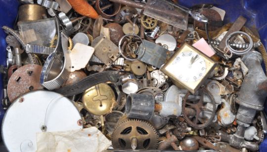 A collection of vintage spare watch and clock parts to include wrist watch faces and movements, enamelled clock faces, cogs bolts etc.