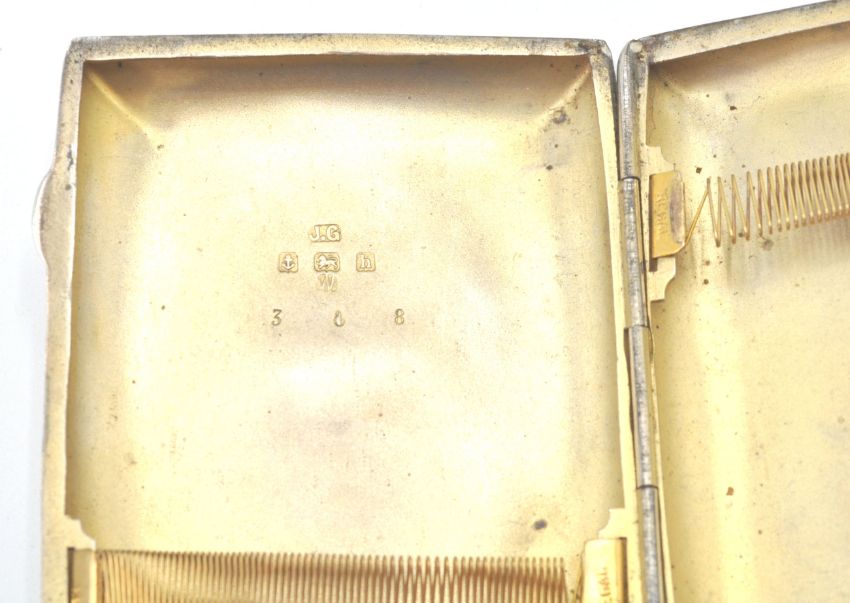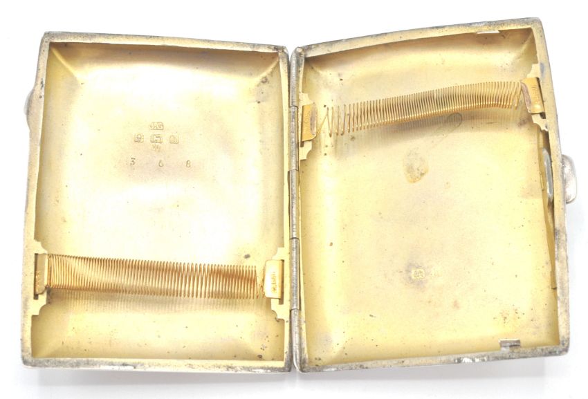 An early 20th Century Edwardian silver hallmarked cigarette case of rectangular bowed form having engine turned decoration and gilt interior. Hallmarked for Birmingham date letter H 1907. Makers mark for Joseph Gloster. Together with a silver hallmarked vesta case. Total weight 77g. Case measures 8cm long by 6cm wide (when closed).