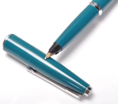 A vintage Parker ink pen having a turquoise plastic case and chrome arrow clip to the lid together with a twist mechanism propelling pencil having a rolled gold top with an arrow clip. Both in original packaging. Measures 4 x 16 cm and 5.5 x 15.5 cm