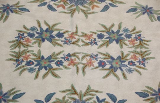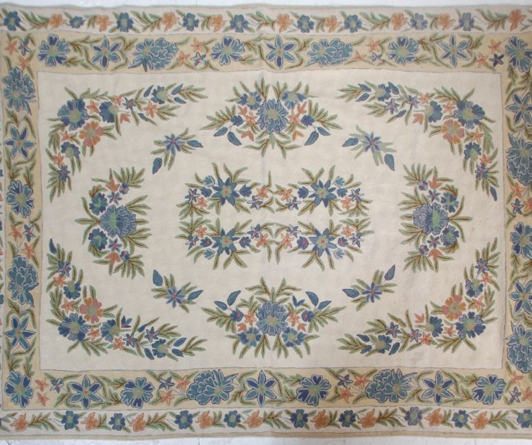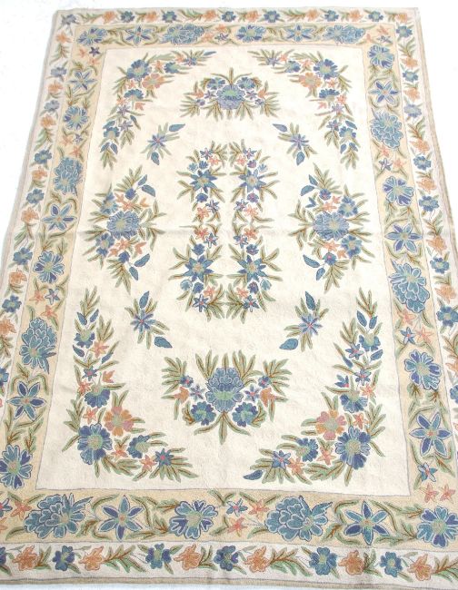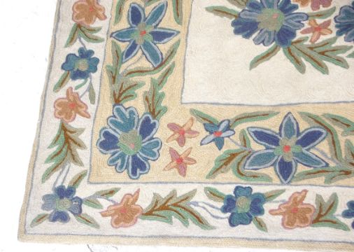 A 20th Century Indian Raj Period style wool floor rug / wall hanging having a cream ground with floral and leaf sprays. Original label present. Measures 6ft x 4ft.