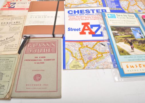 MOTORING MEMORABILIA - Quantity of maps, some vintage, c1960s Ford, Austin car brochures etc plus Morris Minor Lubrication Chart, AA badges (x2), unopened handbook, Glass's Guides & 1959 RAC pamphlet.