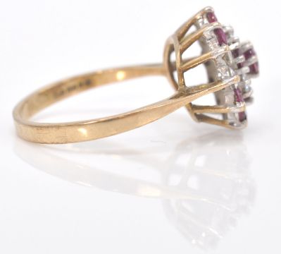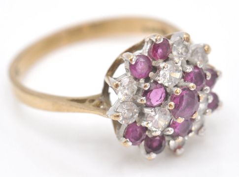 A 9ct gold hallmarked cluster ring. The ring set with amethyst and white mixed cut stones  in basket setting to tapering shoulders and plain shank. Total weight  2.85g. Stone missing.