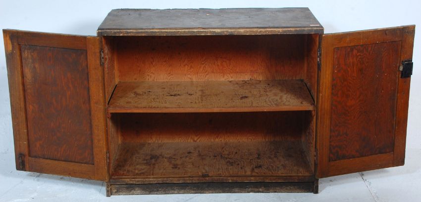 A retro early 20th century shabby chic food locker cabinet cupboard. Of low pedestal form with twin doors enclosing shelving set within. Complete with pull handle. Measures 78x96x50cm.