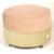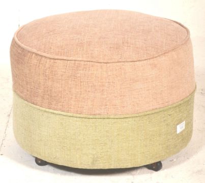 A retro mid century circular barrel foot stool pouffe in a two tone upholstered colourway of beige and pink. Set to block feet. Measures 33 x 43cm.