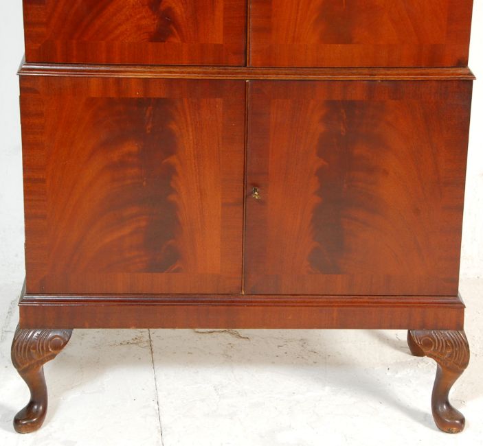 An early 20th Century Queen Anne style flame mahogany drinks / cocktail cabinet of two tiered form, the upper opening to reveal a mirrored interior with shelves within. Raised on cabriole supports. Measures 152x77x40cm.