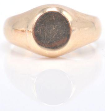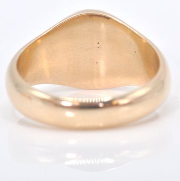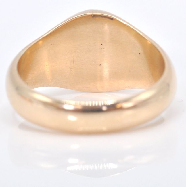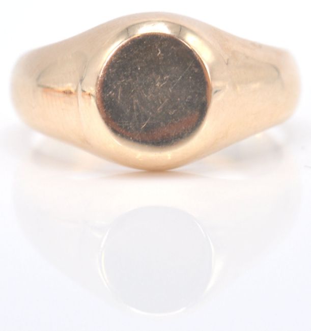 2 Chester hallmarked 9ct gold gentleman's signet rings. One with round cartouche in rub over setting, the other in rose gold with square cartouche and reeded tapering shoulders. Hallmarked for Chester 1917 and 1911. Total combined weight 15.71g