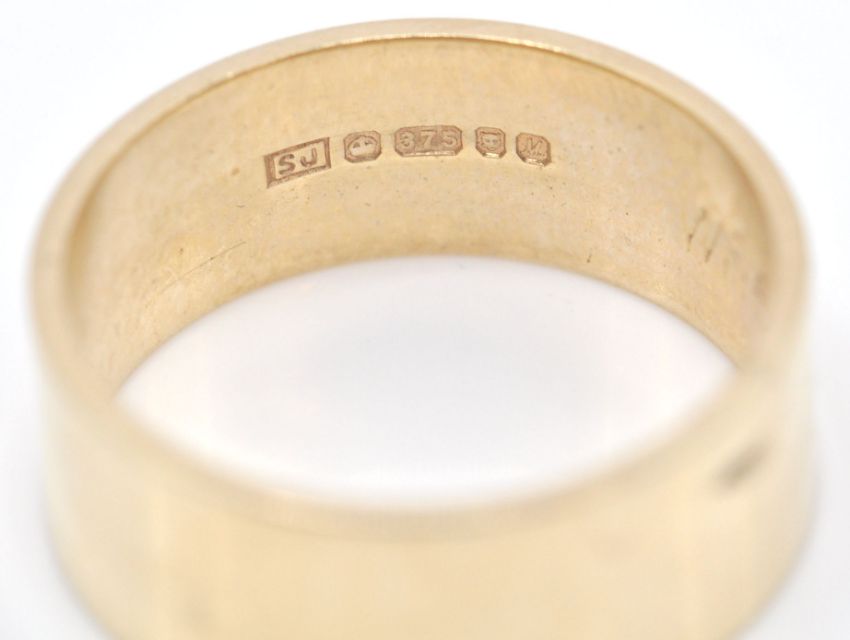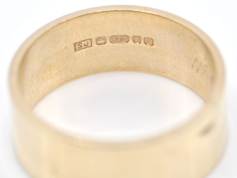 2 hallmarked 9ct gold band rings. One hallmarked for London 1986, sponsors mark SJ, weight 3.74g together with another hallmarked Birmingham band ring. Total combined weight 8.85g