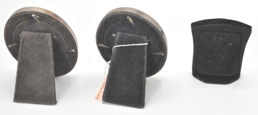 A matching pair of English silver hallmarked photo frames of oval for with velvet covered backs. Both hallmarked for Sheffield date letter L 1985. Together with an Art Nouveau style silver photo frame. Gross weight 229g. Oval frames measure 11.5cm tall.