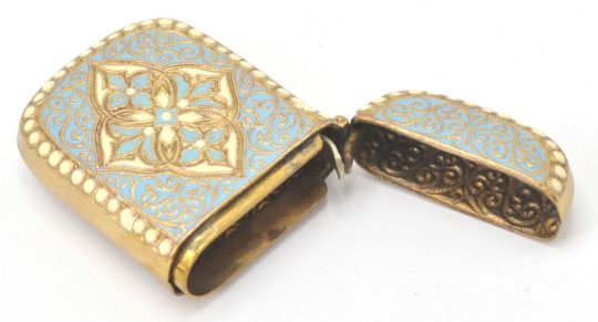 A gilded white metal and enamel 20th century match vesta. The champleve turquoise and enamel worked sides with strike to the base.  Together with a white metal sovereign holder with inset later compass. Weighs 36g. Measures 4cm.