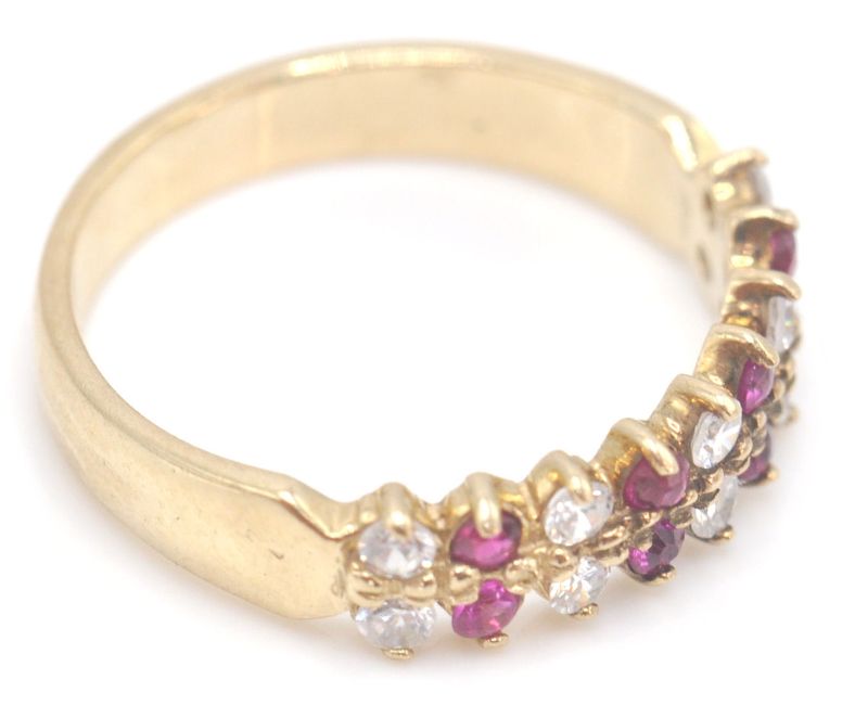 A 9ct gold red and white 18 stone ring. The ring with prong mounted rows of red and white stones. Total weight 2.6g / Size M