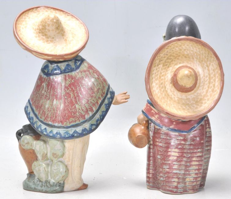 A pair of Lladro ceramic figurines in the form of a Mexican boy wearing a Sombrero and a poncho together with a Mexican girl holding water jugs. Both marked Lladro to the bases. Measures 20cm tall.