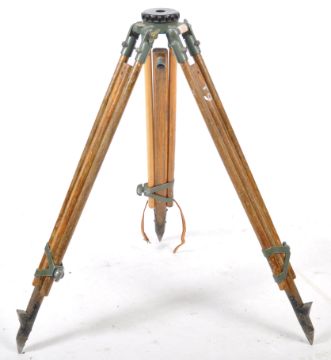 A good  early 20th century wooden and cast metal surveyors tripod stand. The tapering wooden legs stretchers having tapering feet. Completed with bracket top having central screw thread centre.  A set of 3 retro 20th century wooden and cast metal surveyors tripod stands. Each with tapering wooden  legs, 2 with extending metal spike feet and one with tall one piece legs. Completed with bracket tops having central screw thread centre. Measures tallest 150 / 100cm approx not extended x2