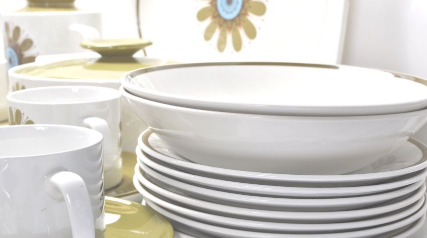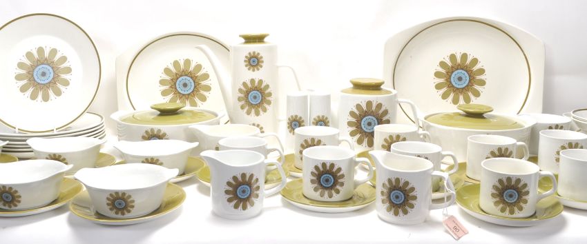 A extensive mid 20th Century 1960's English J. & G. Meakin Studio china part dinner / tea and coffee service having floral and green patterns. The service comprising a teapot, coffee pot, ten cups and ten saucers, two milk jugs and two sugar bowls, two meat platters, six soup bowls and saucers, six bowls, seven dinner plates, six green plates, one salt and pepper and two larger bowls. All bearing marks to the bases.