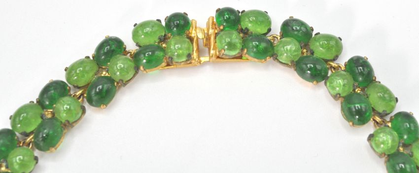 A signed mid century Christian Dior Bijoux Costume jewellery gilt metal and emerald cabochon glass necklace with whites stone set flower head spacers.  Complete in the original box. The clasp  Marked Ch Dior 1967. ( af)  Length 43cm. Weight 84g.