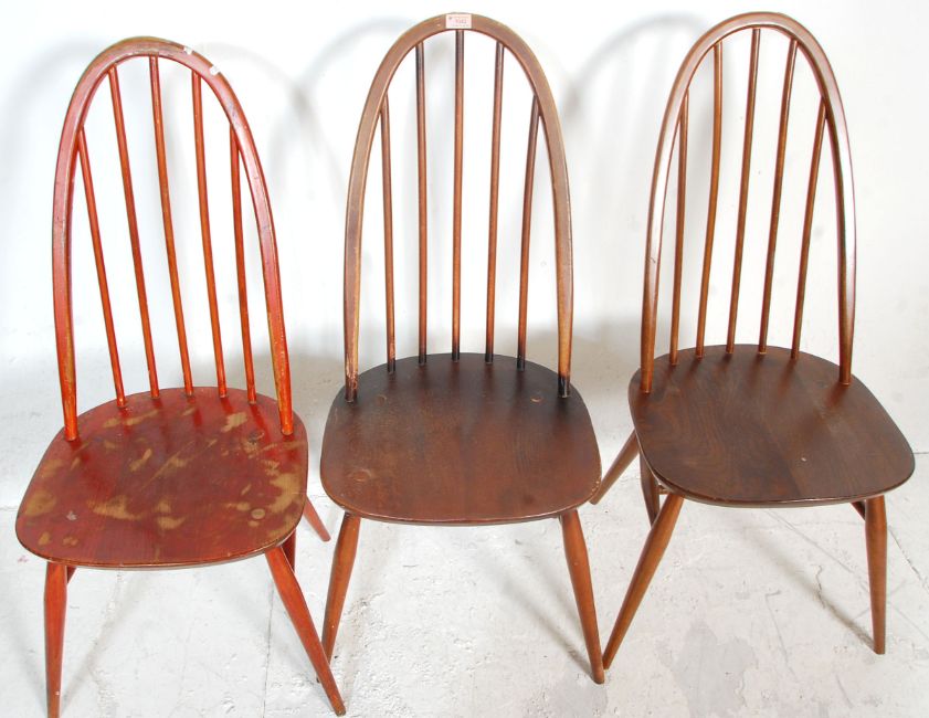 Lucian Ercolani for Ercol Furniture - A set of 6 mid century Ercol beech and elm wood Quaker pattern dining chairs. Raised on turned legs with stretchers having saddle seats with hooped back rests to each. Measures 97x42x41cm.