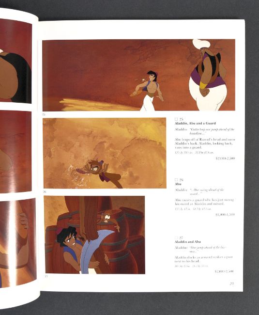 Animation - Walt Disney - an interesting collection of x3 vintage Sotheby's auction catalogues for Walt Disney artwork. ' The Art Of The Little Mermaid ' 1990, ' The Art Of Aladdin ' 1993, and ' The Art Of Who Framed Roger Rabbit ' 1989. All the property of ex-Disney animator Richard Bazley. The Roger Rabbit catalogue has been autographed by Bazley to the first page. Interesting collection.