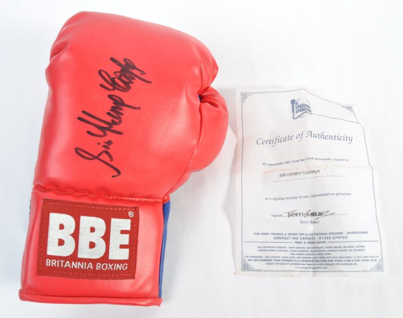 Sir Henry Cooper (1934-2011) - British Heavyweight Boxer - rare autographed boxing glove. The glove being a BBE glove in red and blue, signed neatly to the front in black ink. Undedicated. With certificate from A1 Sporting Speakers.