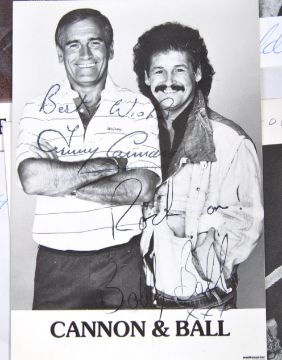 The Peggy Cowan Collection - Wardrobe Mistress at The Cliffs Pavillion, Southend - a collection of 60+ assorted signed / autographed photographs of various stars and personalities. To include; Jeffrey Archer, Norman Wisdom, Cannon & Ball, Keith Harris, The Grumbleweeds, Freddie Starr (several), The New Seekers, Leo Sayer, Frankie Vaughan, Warren Mitchell, Rod Hull & Emu, Victor Borge, Little & Large, Val Doonican, and others. Mixture of printed and handsigned, some dedicated To Peggy. Interesting collection.