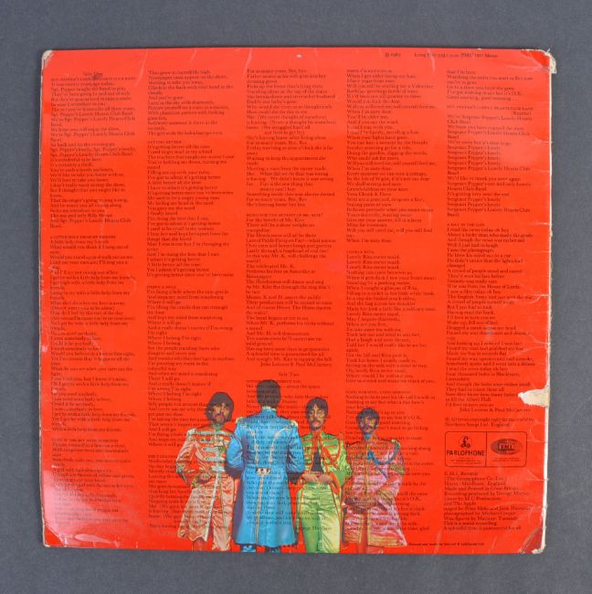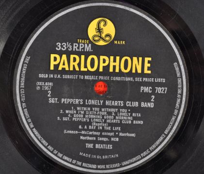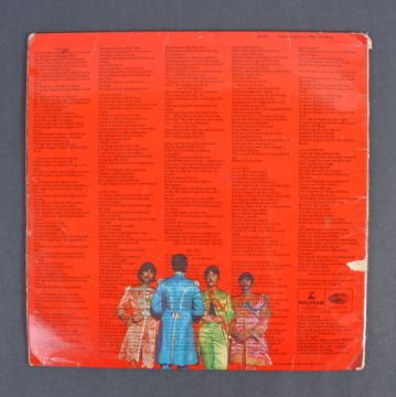 The Beatles - Sgt Pepper's Lonely Hearts Club Band - an incredibly rare autographed example of the famous record, signed by three members - John Lennon, Paul McCartney and Ringo Starr. The autographs within the gatefold sleeve - Starr and Lennon obtained during the period and each have signed in blue biro next to their respective images. A later McCartney autograph has been pasted-in next to his image - the autograph in black ink on a section of envelope. All were obtained in person by the original owner, who was keen to point out a faint George Harrison autograph next to his image, but this one was traced into the album to 'make it complete' many years ago, so it must not be considered signed by Harrison. The vinyl record itself being PMC 7027 XEX 638, and appears well played with several scratches. A rare autographed record, by three members of the most famous band on the planet.