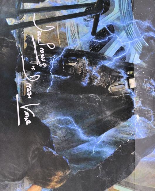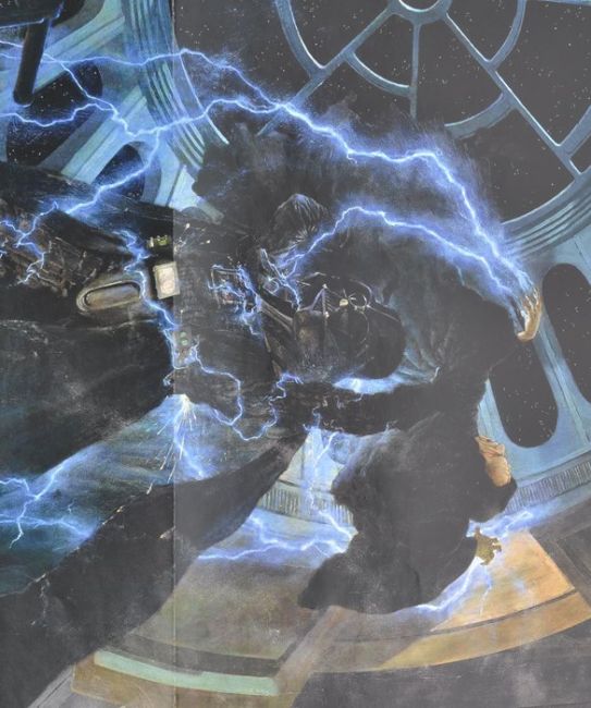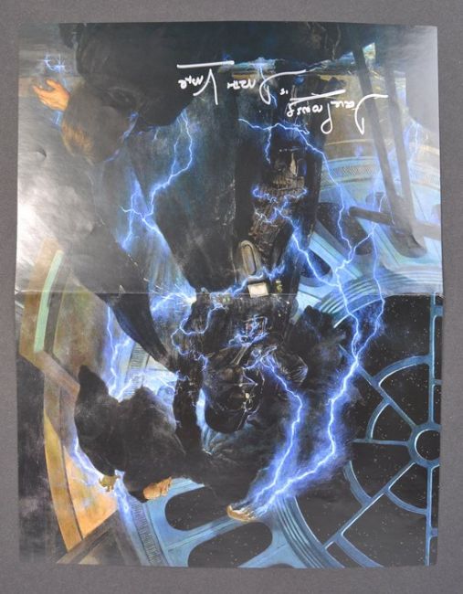 David Prowse (also known as Dave Prowse) - Star Wars - Darth Vader - an autographed poster depicting Darth Vader fighting with Emperor Palpatine. Signed neatly by Prowse in silver ink to a dark area of the poster, adding his character name. Folded. Measures approx 14x11". Impressive signed poster. Obtained in person by the vendor.