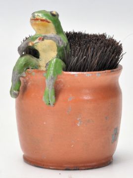 A rare Austrian cold painted metal antique smoking frog set within a barrel being lined with brush inner. The frog with green painted finish having cigarette. 6cm tall.
