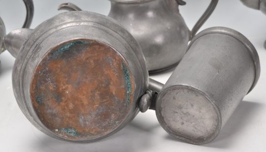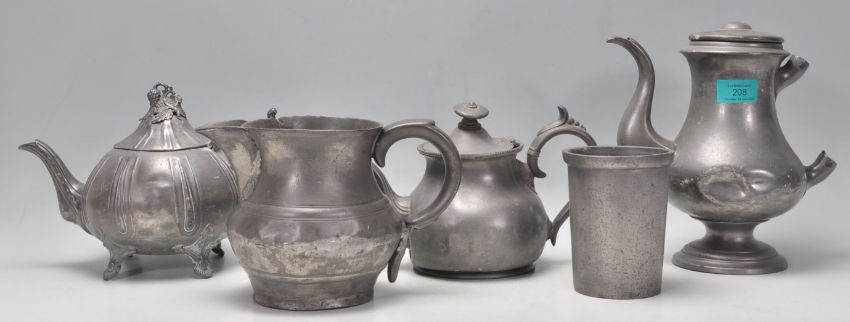 A collection of Georgian pewter ware to include a footed teapot with a raspberry finial, a table jug, teapot with a scrolled handle, cups etc.