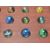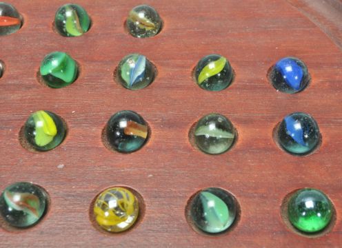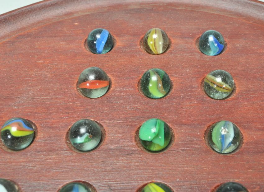 A 20th Century solitaire board game having a full set of coloured swirl glass marbles on a circular mahogany base. 34cm in diameter.