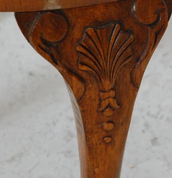A mid century Queen Anne revival walnut coffee / occasional table having a walnut veneered top raised on four cab legs with carved scallop shell motif's to the top of each. 46cm x 60cm.