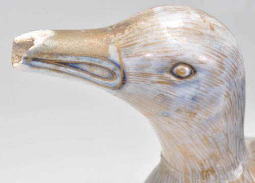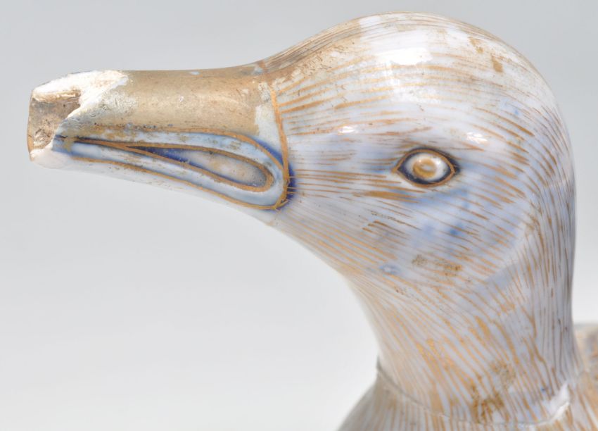 A lovely late 19th Century Chinese ceramic teapot moulded in the form of a Duck raised on a floral base finished in blue with red flecks and gilt detailing. Two blue character marks to base. A/F damage to the spout.  21cm tall.