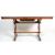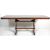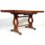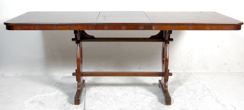 A large 20th Century oak Jacobean revival extending refectory dining table having a pop up center leaf. Raised on pierced lyre shaped supports united by peg jointed stretchers. Under the flared top is Tudor Rose carved decoration. Dimensions are 77cm high x 150/196cm wide x 90cm deep.