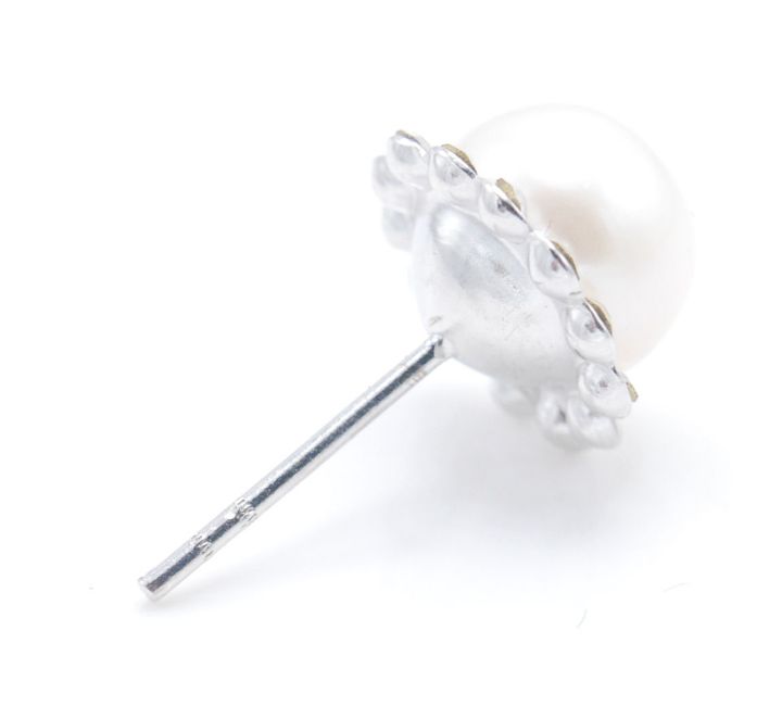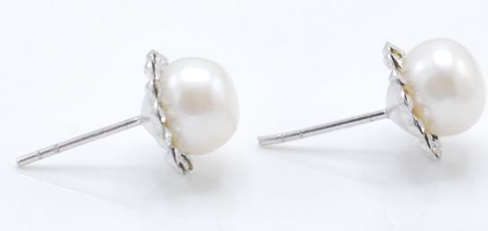 A pair of ladies silver stud earrings set with white pearls with a halo of round CZ stones. Butterflies marked 925.