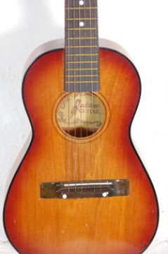 A vintage Audition made acoustic six string guitar having a reinforced steel neck, original tag and paper label to inner.