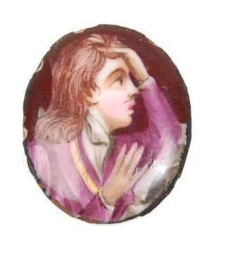 A good group of three lava cameos with each cameo depicting a gentleman. Together with two enameled plaques one depicting a courting couple and the other a gentleman.