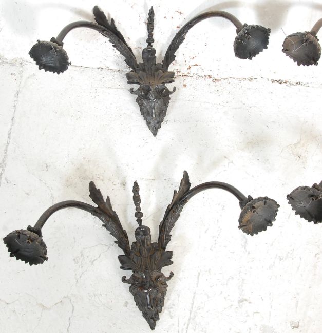 A 20th century cast bronze chandelier / electrolier having rams head masks with scrolled arms, floral sconces to each. 25cm x 42cm.