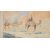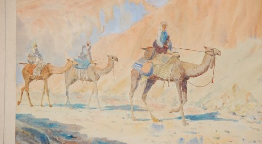 A good early 20th Century vintage watercolour painting depicting three men riding camels in the desert. Signed to the bottom right Wadi Musa, Suze. Framed and glazed. Measures 33cm tall by 42cm wide. 34cm x 42cm.