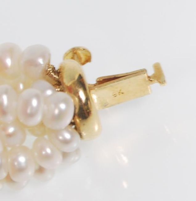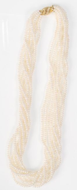 A good quality ladies eight strand pearl necklace having a 9ct gold clasp of twist design. Measures 18 inches.